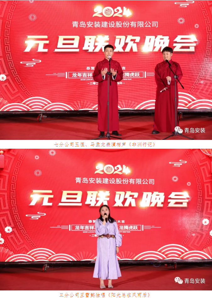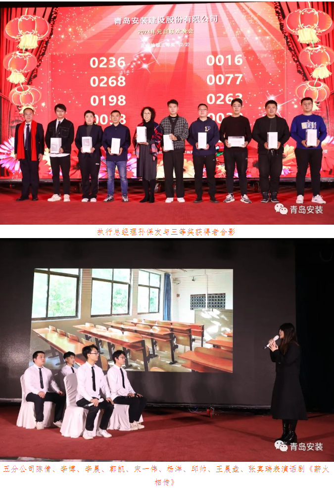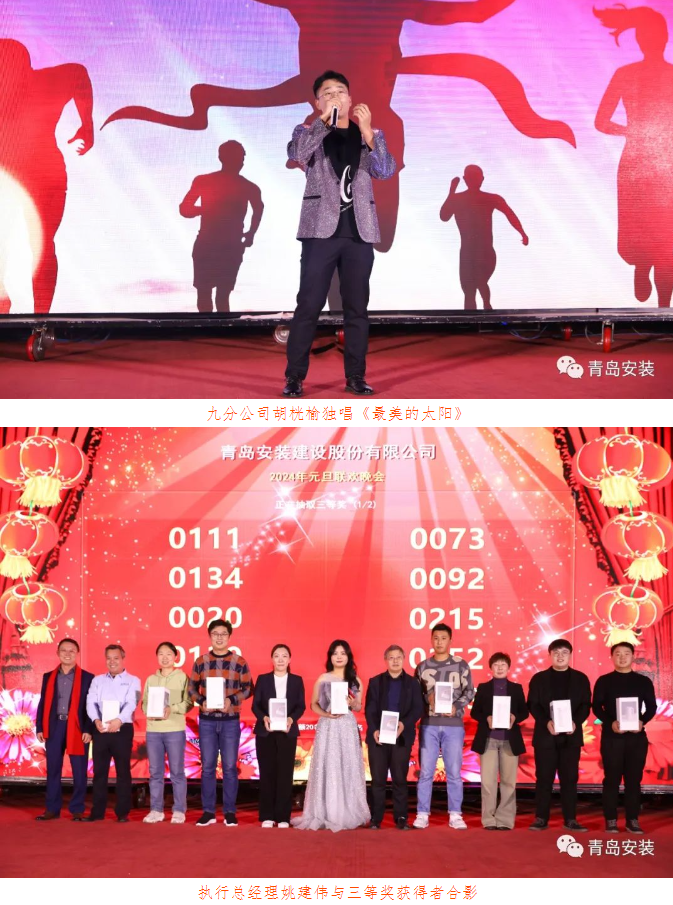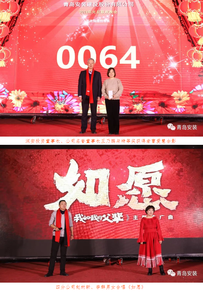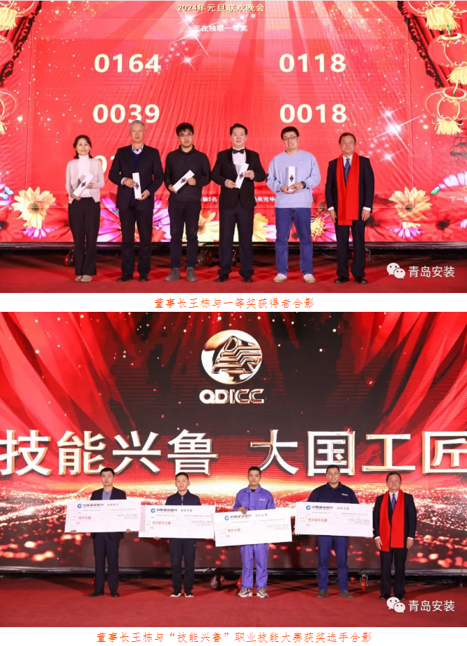首先,由公司黨委書記張衛財同志致新年賀詞。張衛財說,受王乃鵬董事長、王棟董事長的委托,代表公司董事會和黨委,向公司全體員工一年來的辛苦勞動表示衷心的感謝!對支持安裝公司工作的員工家屬表示誠摯的謝意!他表示,自2020年以來,新冠疫情給我們的工作帶來了巨大的影響,公司國內、國外全體員工在董事會的正確領導下,秉承“誠信 合力 創新 共贏”的企業發展理念,不畏困難,勇毅前行,創造了比疫情前更要好的業績,同時,也給公司成立六十五周年送上了一份滿意的答卷,可喜可賀!他強調,即將到來的2024年,相信在公司新一屆董事會的帶領下,在全體員工的努力下,我們一定會克服一切困難,再創佳績!最后,張衛財祝福公司全體員工以及所有家屬,在新的一年,身體健康,工作順利,闔家幸福,萬事如意,祝愿青島安裝的明天更加美好!